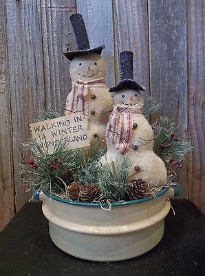 Primitive Handmade Snowmen in Vintage Enamelware Pot - Holiday/Winter Decoration