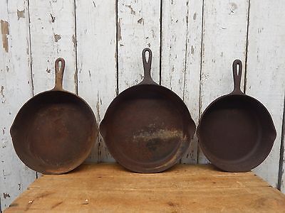 3 Antique Cast Iron Skillets ~ Old Vintage Cookware / Rustic Cabin / Farm Decor