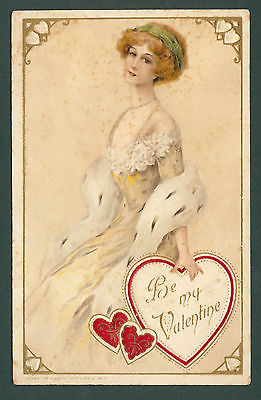 Vintage German Postcard Be My Valentine Lady in Stole Hearts John Winsch 1913