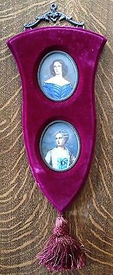 Antique Victorian Porcelain Painted Cameo Portraits Red Velvet Frame Signed E.T.