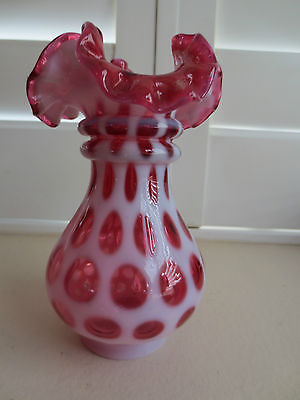 Lovely Vintage Fenton Ruby Red Glass White Opalescent Coin Dot Ruffled Vase 6''