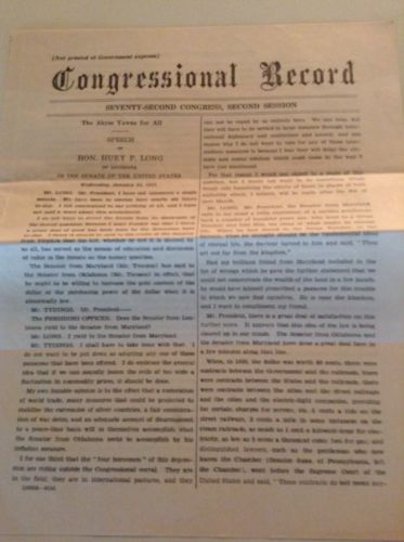 Title (ebay affiliate link): Huey Long Louisiana Sen. Speech 72nd Congress "The Abyss Yawns For All" 1933