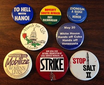 Title (ebay affiliate link): Interesting Lot of 8 Varied Cause And Social Issue Pinback Buttons