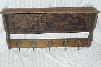 Antique Wood Carved Kitchen Copper Pot Rack Mud room 5 Brass Hooks