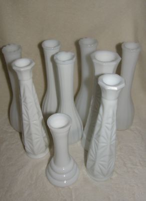 ASSORTED LOT OF VINTAGE MILK GLASS BUD VASES (9)