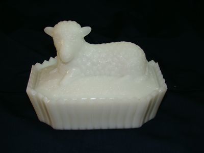 WESTMORELAND MILK GLASS COVERED LAMB ON PICKET FENCE