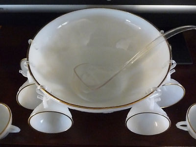 VINTAGE Hocking Milk Glass Grape Pattern Punch Bowl Set