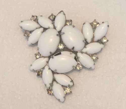 Vintage 2 1/4" Silvertone & Milk glass W/ Clear Rhinestones Brooch/Pin