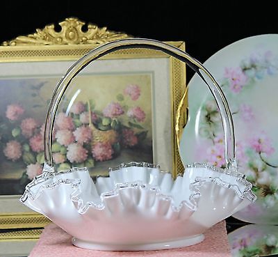 FENTON Silver Crest Basket Handle Bowl SUPER LARGE 12" MILK GLASS Candy Bridal