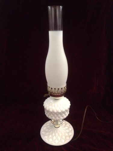 Title (ebay affiliate link): Vintage White Milk Glass Hurricane Diamond Quilted Electric Table Lamp 21" Tall