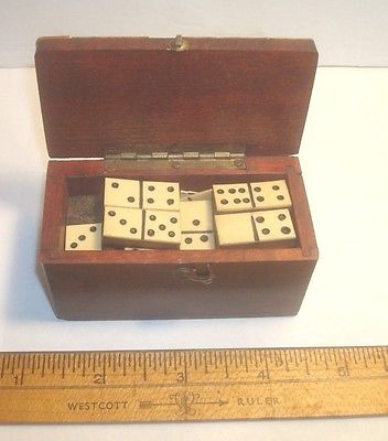 Title (ebay affiliate link): ANTIQUE TINY BONE DOMINOS GAME IN SMALL WOODEN HINGED BOX. cMID 1800'S. 26 PCS.