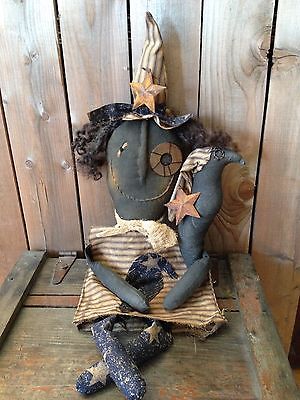 Title (ebay affiliate link): Primitive Black Folk Art Witch Doll w Crow Halloween Grungy Lambs Wool Hair Star