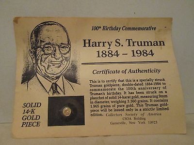 Solid 14K Gold 100th Anniversary HARRY S. TRUMAN Mini Coin COA