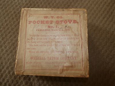 Title (ebay affiliate link): Antique WT Co Patent 1887 Pocket Stove No. 1 in Original Box w/ Instructions