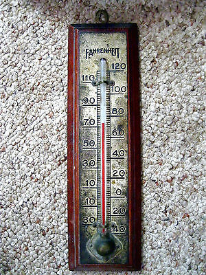 antique FAHRENHEIT Wall THERMOMETER Solid Mahogany Brass 2.5 x 9.5" Made In USA