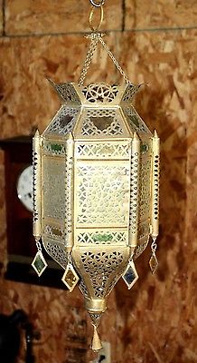 Title (ebay affiliate link): ANTIQUE /VINTAGE STAINED GLASS & PIERCED BRASS HANGING MOROCCAN CANDLE LANTERN.