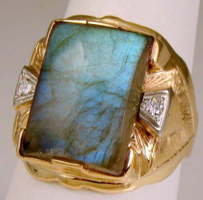 MENS RING ANTIQUE VINTAGE LABRADORITE DIAMOND 10K