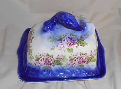 Antique Ceramic Covered Cheese Serving Dish Blue White Flowers