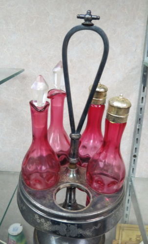 Title (ebay affiliate link): victorian era cranberry / red castor set / 4 thumbprint bottles / silver plate