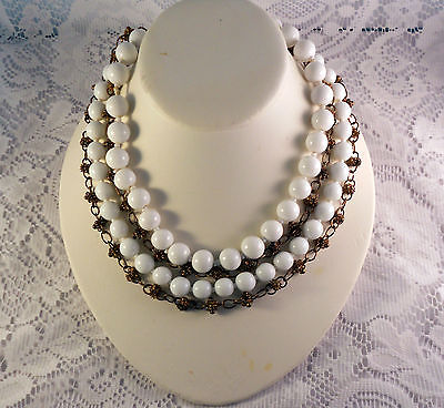 Vtg MIRIAM HASKELL 4-Strand Milk Glass Bead and Woven Metal Choker Necklace