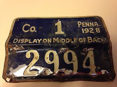Antique 1928 PA Co 1 Blue Enamel Hunter Hunting License Plate #2994 Man Cave WOW
