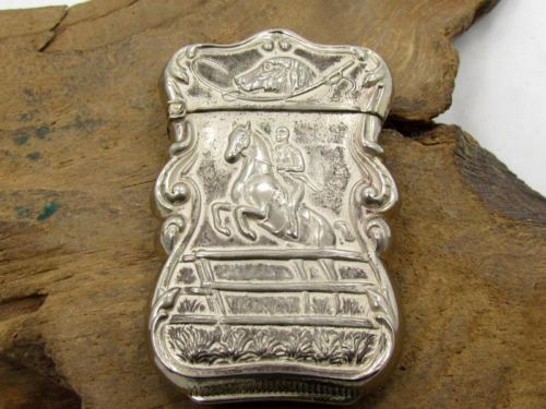 Title (ebay affiliate link): RARE ANTIQUE OLD MARKED SILVER JUMPING HORSE RIDER DOG WHIP MATCH SAFE VESTA
