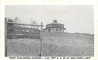 Title (ebay affiliate link): Lisbon Ohio~Fort Tuscarora Museum~Wood Roadside Sign~Guilford Lake~1940s B&W PC