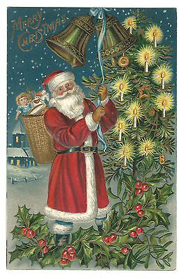 1907 Christmas Postcard Santa Claus Ringing Bells Tree Candles Holly Embossed