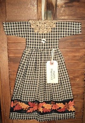 GRUNGY~PRIMITIVE WALL~CUPBOARD~DOLL DRESS BLACK HOMESPUN AUTUMN LEAVES FOLK DECO
