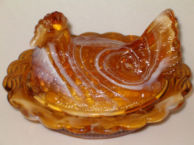 AMBER & MILK SLAG GLASS HEN CHICKEN ON NEST BASKET DISH