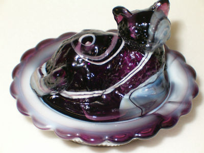 PURPLE & MILK SLAG GLASS CAT KITTEN ON NEST BASKET SALT