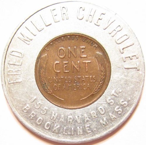 Title (ebay affiliate link): 1948 Encased Wheat Cent MILLER CHEVROLET 50's Auto Shop Brookline MA Lucky Token