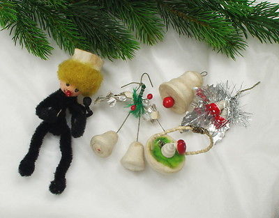 5 x Vintage Spun Cotton Christmas Ornaments, Basket, Bells, Toadstools, Figurine