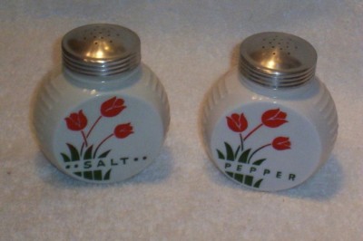 2 HOOSIER CABINET SALT AND PEPPER JARS MILK GLASS