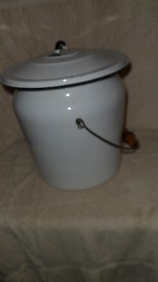 PORCELAIN CHAMBER POT DIAPER PAIL WOOD HANDLE BLACK TRIM (*)