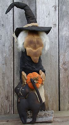 PRIMITIVE/WITCH/OLD CRONE/HALLOWEEN/CAT/DOLL/HANDMADE/PUMPKIN/28 IN/BARN WOOD