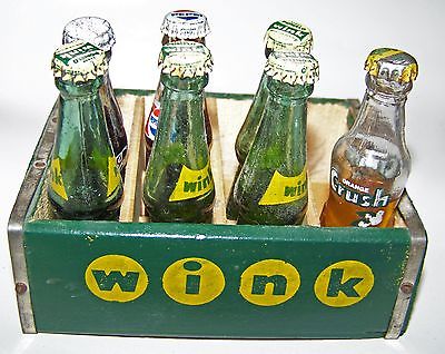 7 Vintage Miniature Glass Soda Bottles w/Case-Wink,Pepsi,Coca Cola,Orange Crush