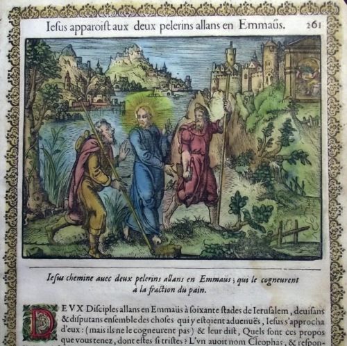 Title (ebay affiliate link): 1614 CHRIST APPEARS TO PILGRIMS - 2 large FOLIO BIBLE Woodcuts HAND COLOR
