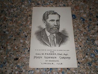 Old Geo. W. Parker Dist. Agt. Phenix Insurance Co Lincoln IL Business Trade Card