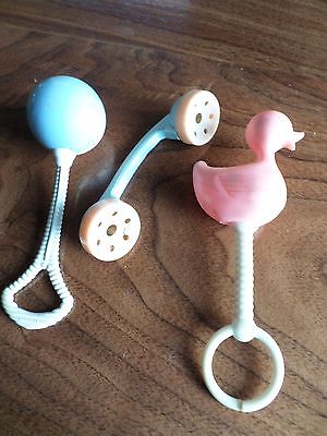 Title (ebay affiliate link): Lot Three Vintage Telephone- Ball- Duck- Baby Rattle Hand Plastic 1950s-60s