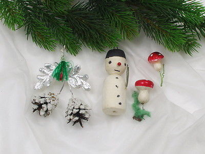 Title (ebay affiliate link): 4 x Vintage, Spun Cotton Christmas Ornaments, Snowman, Toadstools, Cones