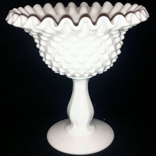 Title (ebay affiliate link): 5 7/8" x 5 5/8" Crimped or Ruffled Comport Compote Milk Glass Hobnail by Fenton