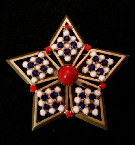 Title (ebay affiliate link): Signed Vintage Hobe' Star Brooch w/red/white milk glass & blue rhinestones