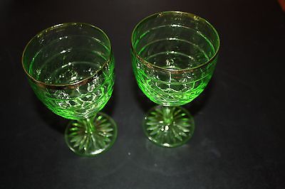 2 Green Vaseline Depression Glass Goblets Water Wine Glass Vintage Gold Gild