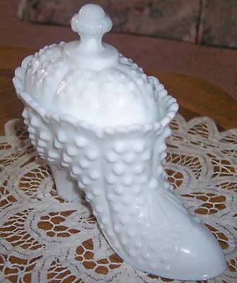 VINTAGE FENTON MILK GLASS HOBNAIL SHOE CANDY DISH W/LID