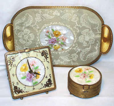 Title (ebay affiliate link): Antique VANITY TRAY CLOCK TRINKET Container SET Beauty!