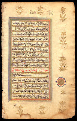 Title (ebay affiliate link): 1780 Illuminated Koran Manuscript Leaf Red Sura Gold Floral Borders Mughal India