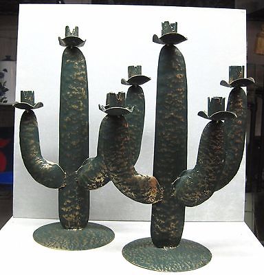 2 Large Metal Cactus Candlestick Holders Green with Gold