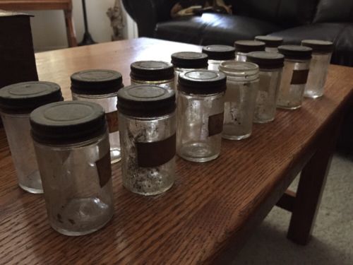 Vintage Antique Set Of 14 Heavy Glass Jars With 13 Lids No Cracks