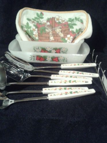 Title (ebay affiliate link): Vintage Glasbake Milk Glass Strawberry Dishes & Utensil Lot